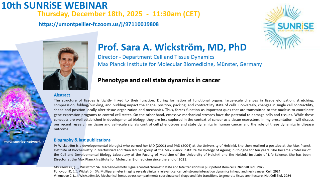 SUNRiSE is proud to announce the webinar of Sara A. Wickström, MD, PhD, on Thursday, December 18h, 2025 at 11.30 am: « Phenotype and cell state dynamics in cancer ».